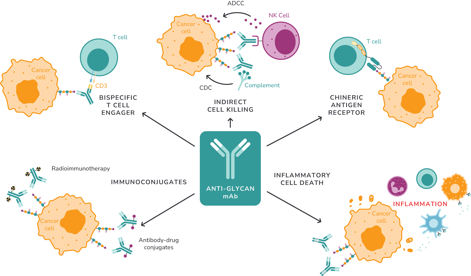Scancell has developed the GlyMab® platform to generate a series of high affinity tumour specific monoclonal antibodies (mAb) targeting glycans that are over-expressed on cancer cells. Each mAb has high specificity for particular glycan molecules, making them attractive development candidates. In addition to being potential therapies in their own right, the specificity of the anti-glycan mAbs enables their development into a range of antibody-based therapies with differing mechanisms of action.